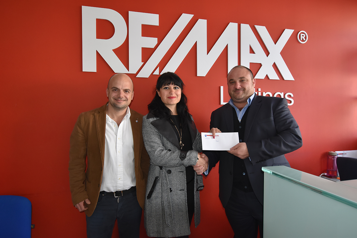 nspire: Michael Bonello (right), Board Member of RE/MAX & Friends Foundation, presenting a percentage of the proceeds to Giovanna Mirabile Bartolo, Fundraising Events Manager at Inspire in the presence of Jeffrey Buttigieg, COO of RE/MAX Malta.