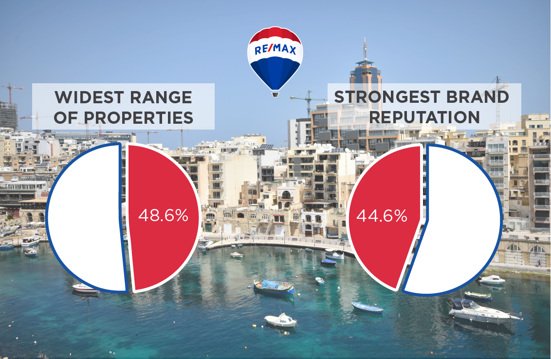 While over 64 per cent of respondents chose RE/MAX as the ‘first real estate agency to come to mind’ in Malta, the survey also highlighted that RE/MAX is the real estate company with the most properties on its books.