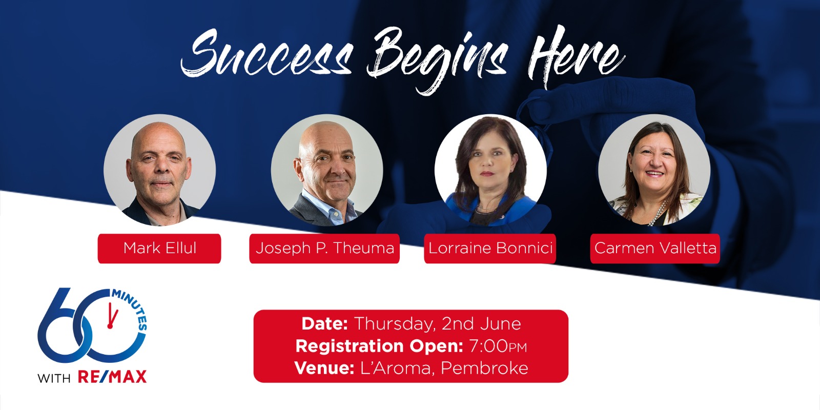 Join us in this 60 Minutes with RE/MAX career event that will be held on the 2nd of June at 7pm, at L’Aroma Restaurant Pembroke. The event is free of charge and open for public registration. For more details, visit http://remax.mt/1aCWMAP
